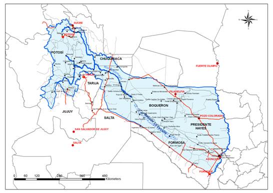 Los tres países tienen una división política administrativa distinta. Bolivia está dividida primero en Departamentos, Provincias y Secciones sucesivamente. Argentina, por Provincias y al nivel más pequeño por Departamentos y Paraguay en Departamentos y Distritos (ver Figura Nº 3). Con el fin de unificar nomenclaturas se adoptará la definición propuesta en la Línea Base Ambiental y Socioeconómica (LBAyS) del año 2007, de la siguiente manera: